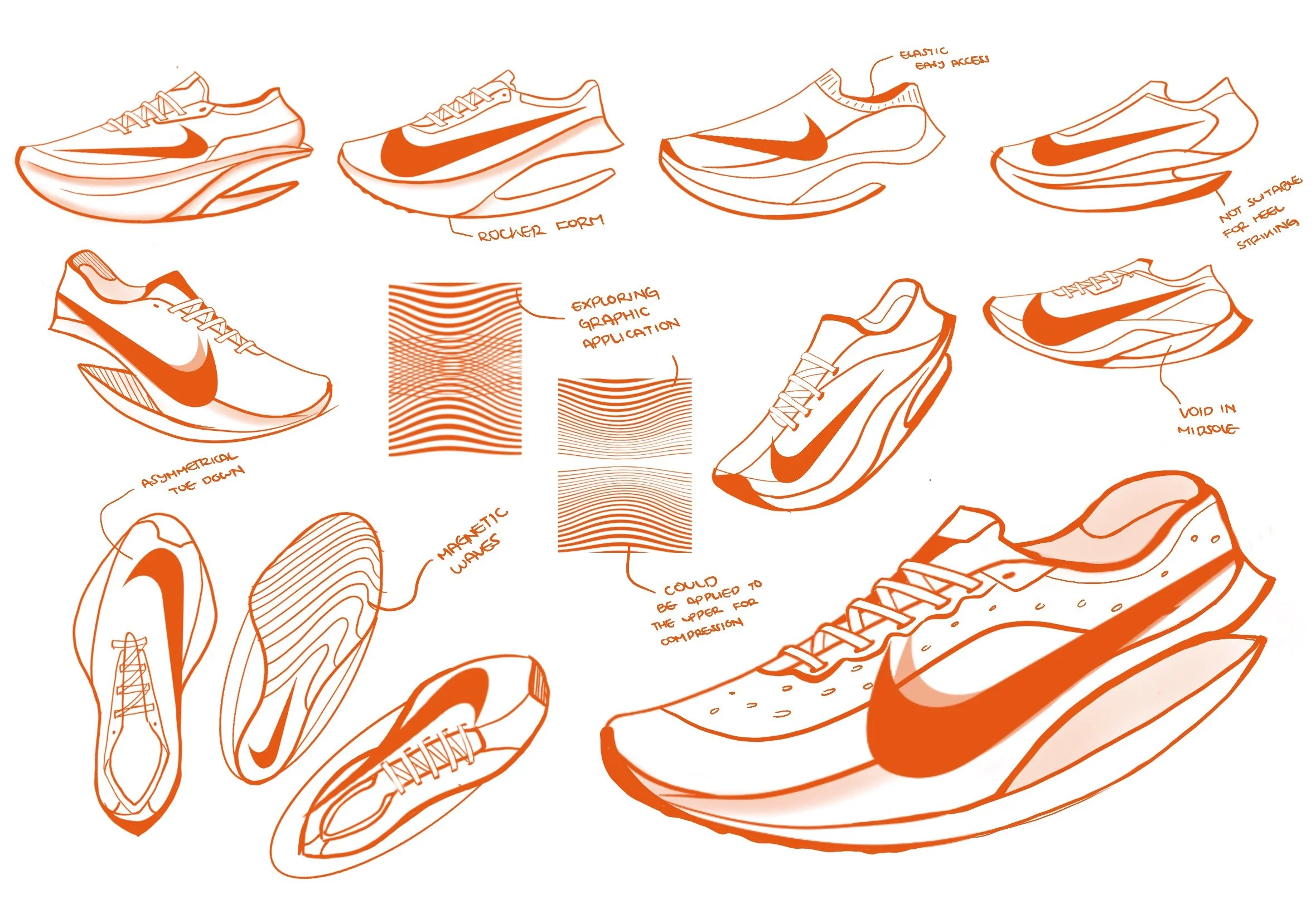 Through iterative sketching, I explore the relationship between midsole proportions and void structures, optimizing for lightweight performance without compromising support. The exploration also investigates the application of magnetic wave patterns to shoe construction, exploring how this could enhance both the functional performance and visual identity of the upper and outsole.